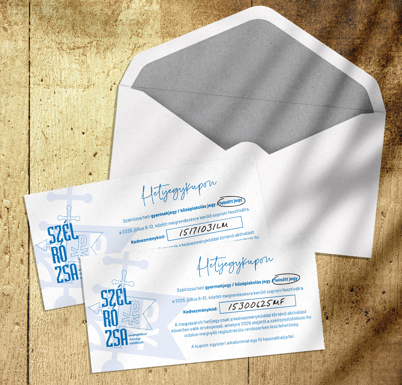 A megvásárolt elővételes hetijegy(ek) kedvezménykódját e-mailben küldjük el. Ne feledd, hogy az elővételes hetijegyvásárlási akció keretében megvásárolt jegy csak akkor érvényes, ha a kuponon található kedvezménykóddal aktiválod is majd! Erre 2026 elejétől a szelrozsatalalkozo.hu oldalon megnyíló regisztrációs rendszerben lesz lehetőség.